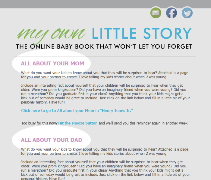 Once we have your child's birth date/due date we will start sending you timely emails (twice a month) that coincide with your child's development. Our emails are brief, to the point and contain a link directly to your child's story. Just click the link and add your thoughts.