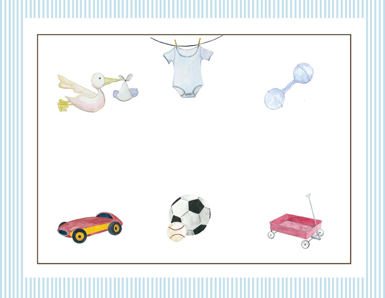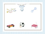 This book features a light blue striped background with some gender-neutral hand-painted graphics along with some more masculine graphics i.e.: racecar, red wagon, and soccer ball.