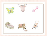 This book features a light pink striped background with some gender-neutral hand-painted graphics along with some more feminine graphics, i.e.: ladybug, daisy and butterfly.