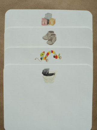 These precious note cards are ideal for gift enclosures or writing thank you notes. Each card is 4 1/4 X 5 1/2 and has rounded corners. The cardstock has the look and feel of linen. Each illustration was hand-painted by our illustrator, Devon Galusha. The envelopes are kraft paper. The stationery is packaged in a reusable envelope. You will receive 12 cards total, the breakdown of designs is as follows: