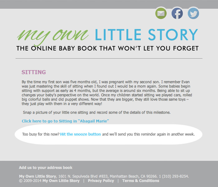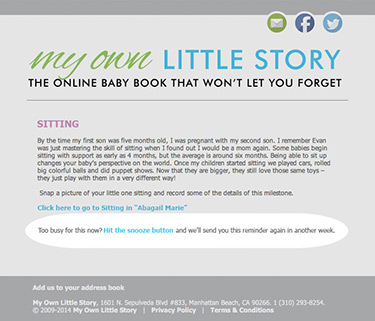 Flexibility is key when you are a parent; so, we designed our Milestone Memory System with a snooze button. We know that timing is everything and each child develops differently. If you get an email and don't have time or your child hasn't reached that particular milestone just click the snooze button and we will remind you again in a week.