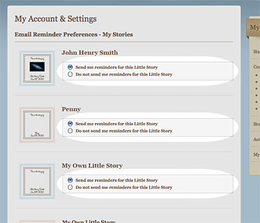 You're in control. Whenever you create a story you make the choice to receive our Memory Milestone reminder emails. In addition, your preferences are managed from story to story, so you can decide to be reminded for one story, all of your stories, or none at all!