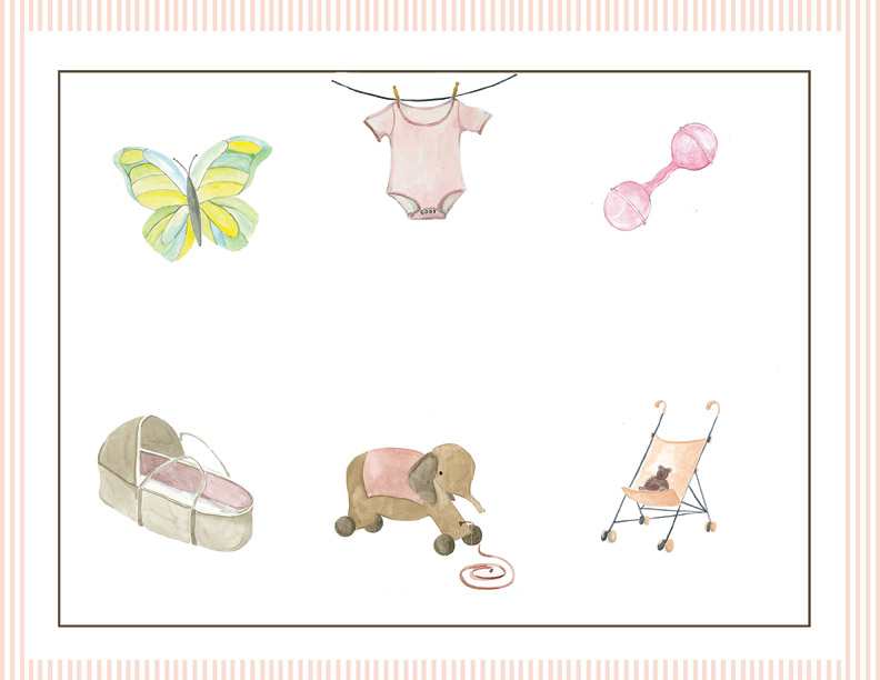 This book features a light pink striped background with some gender-neutral hand-painted graphics along with some more feminine graphics, i.e.: ladybug, daisy and butterfly.